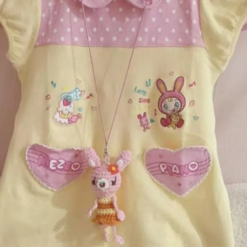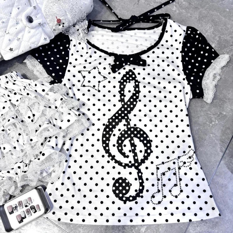 Japanese Mushroom Girl Fake Two Short Sleeve T-shirt Piano Polka Dot Print Tees Summer Y2k Subculture Hot Girl Casual Tops 2000s