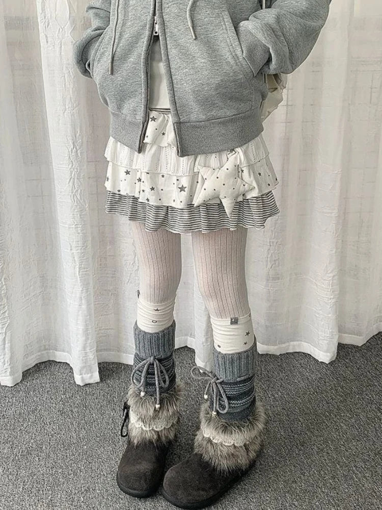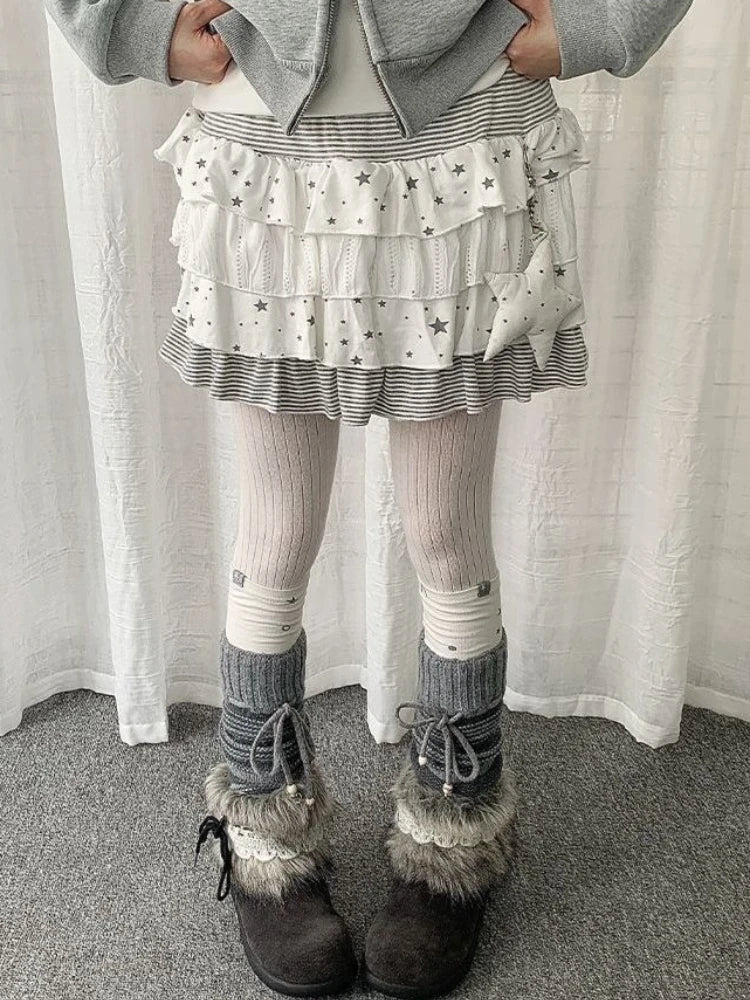 Y2K Aesthetic Star Print Tiered Ruffle Mini Skirt Women High Waist Striped Layered Skirts Harajuku Sweet Cute Casual Clothing