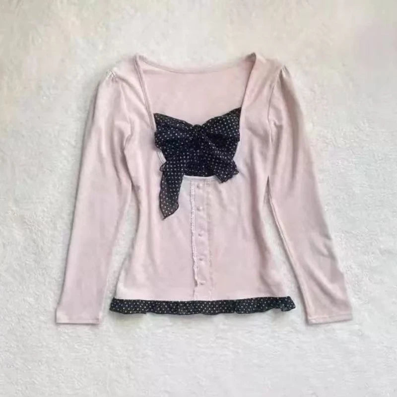 Autumn Korean Y2k Vintage Fake 2 Piece Set Women Elegant Long Sleeve Design Tops Harajuku Female Casual Lace 2000s Chic T-Shirt