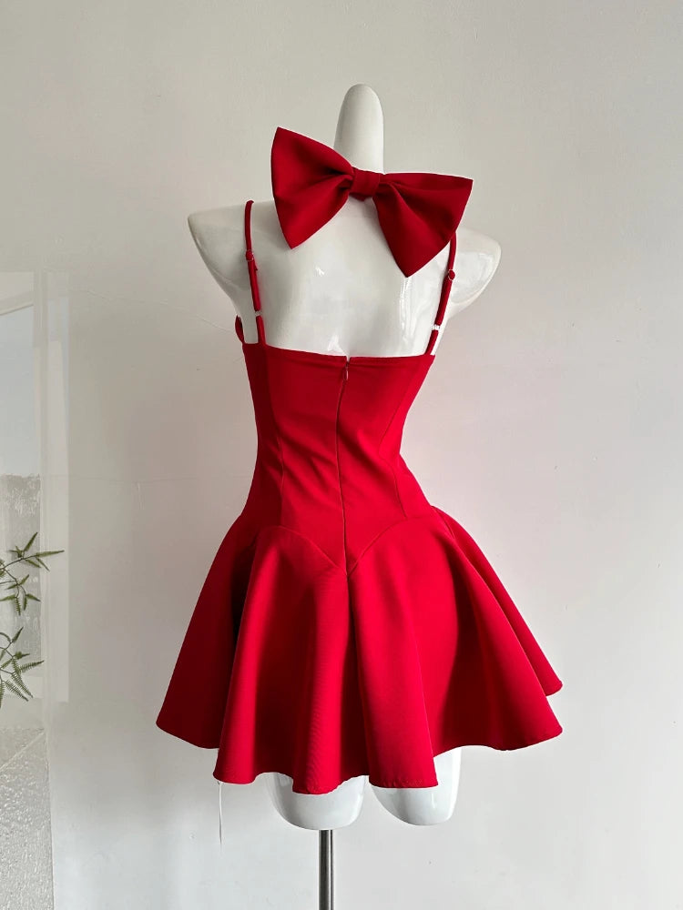 French Elegant Red Sexy Style Dress Women New Year Bow Strap Dresses Fashion Princess Aesthetic Design Sense Party Outfits 2025