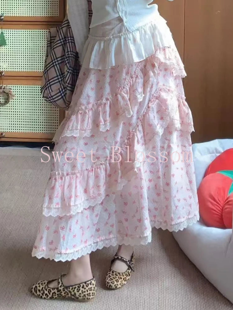 Summer Sweet Pink Bow Print Long Skirt Women's Japanese Fashion High Waist Lovely Skirts New Pretty Y2k Fluffy Aesthetic Clothes