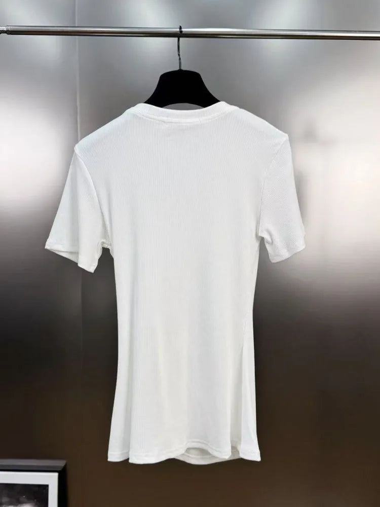 LGRQ 2025 New Round Neck Short Sleeve asymmetrical Slim Fit Irregular Side Pleated Metal Button T-Shirt